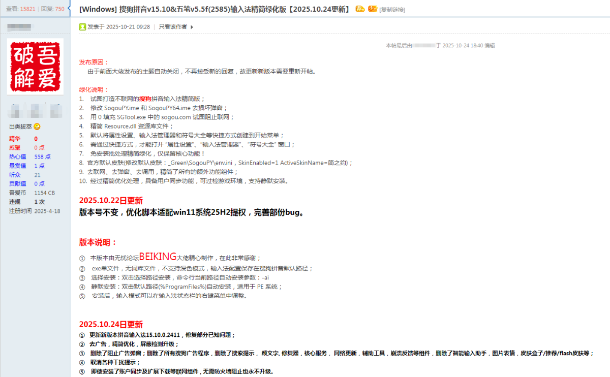 1、本贴标题:【吾爱出品】[Windows] 搜狗拼音v15.9d&五笔v5.5f)去广告精简绿化版【89M】